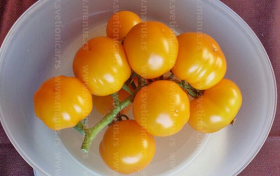 Ova sorta nije starinska. Nastala je u mom plasteniku, u sezoni 2007, otvorenim oprašivanjem jedne rebraste i jedne ravne sorte paradajza koje su zajedno dale ovu veselu, lepu, rodnu i vrlo ukusnu sortu. Pojedini plodovi su takvog oblika, da ako nemate neki orjentirda Vam ukaže na njihovu veličinu - stvarno bi ste pomislili da je neko prelakirao malu žutu bundevu. A "bundeva" jedva 3 cm velika ;). Al je zato ukusna....